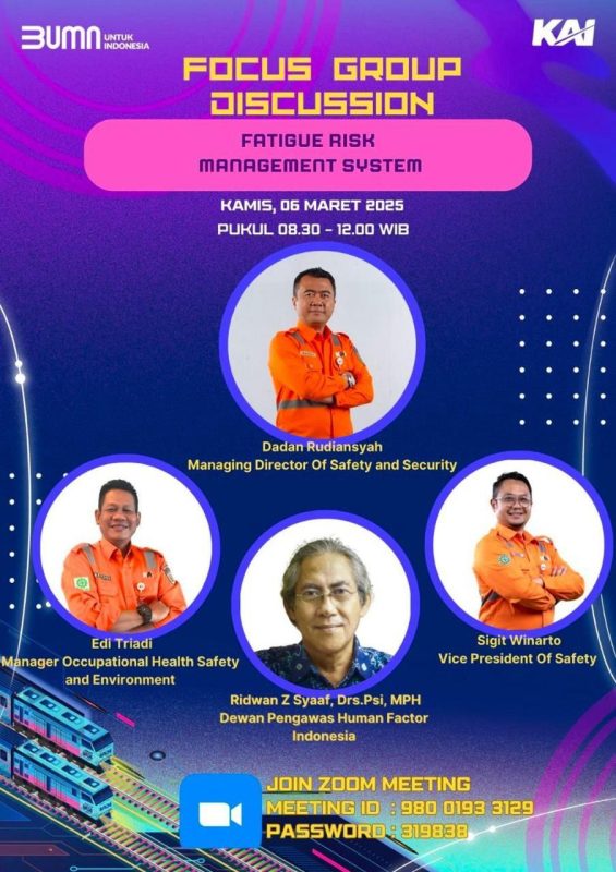 Pada tanggal 6 Maret 2025, Human Factors Indonesia diundang sebagai narasumber FGD PT Kereta Api Indonesia (KAI) untuk membahas Fatigue Risk Management System (FRMS). Diwakili oleh Drs (Psi). Ridwan Zahdi Syaaf, MPH yang menjabat sebagai Dewan Pengawas Human Factor Indonesia.